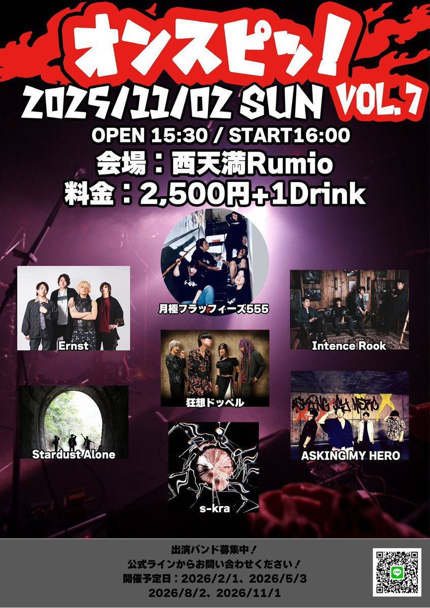 11/2(日) 西天満Rumio オンスピッ!Vol.7 OPEN 15:30 / START 16:00 ADV/DOOR ¥2,500(1D別) 狂想ドッペルは19:20〜 ご予約は diverseeffectindoppelganger@gmail.com まで、お名前、枚数を記載の上、メールをお送りくださいませ